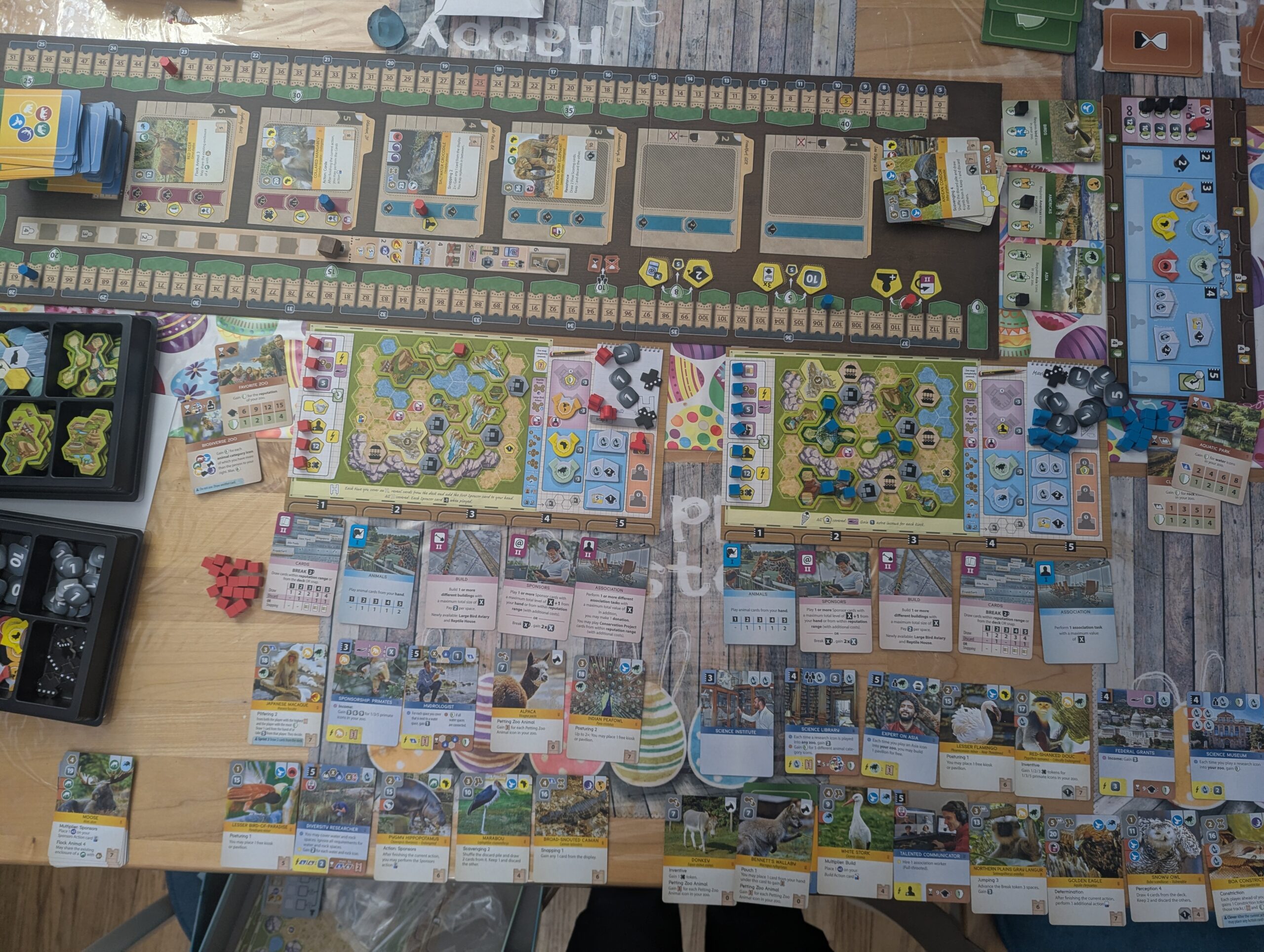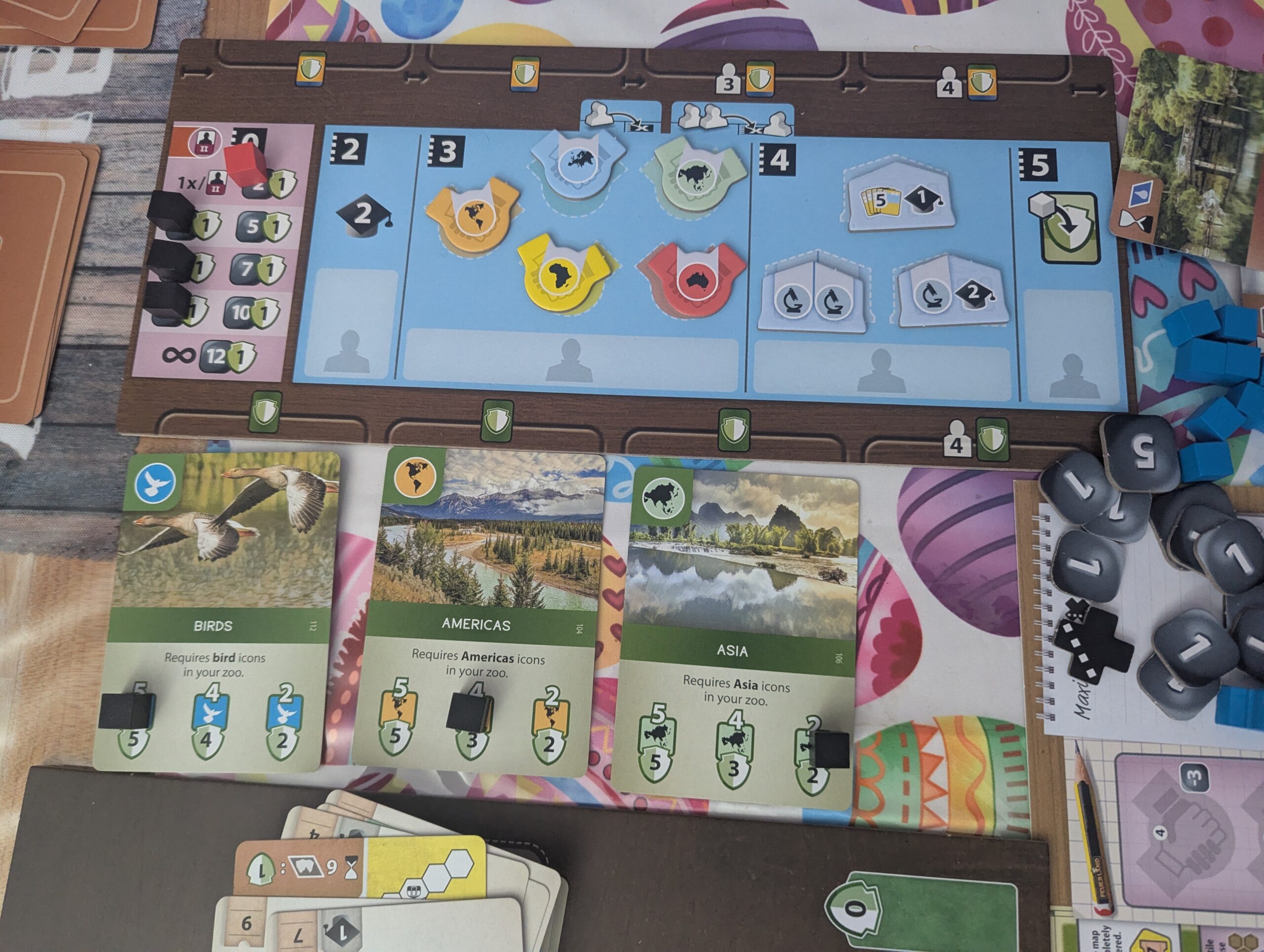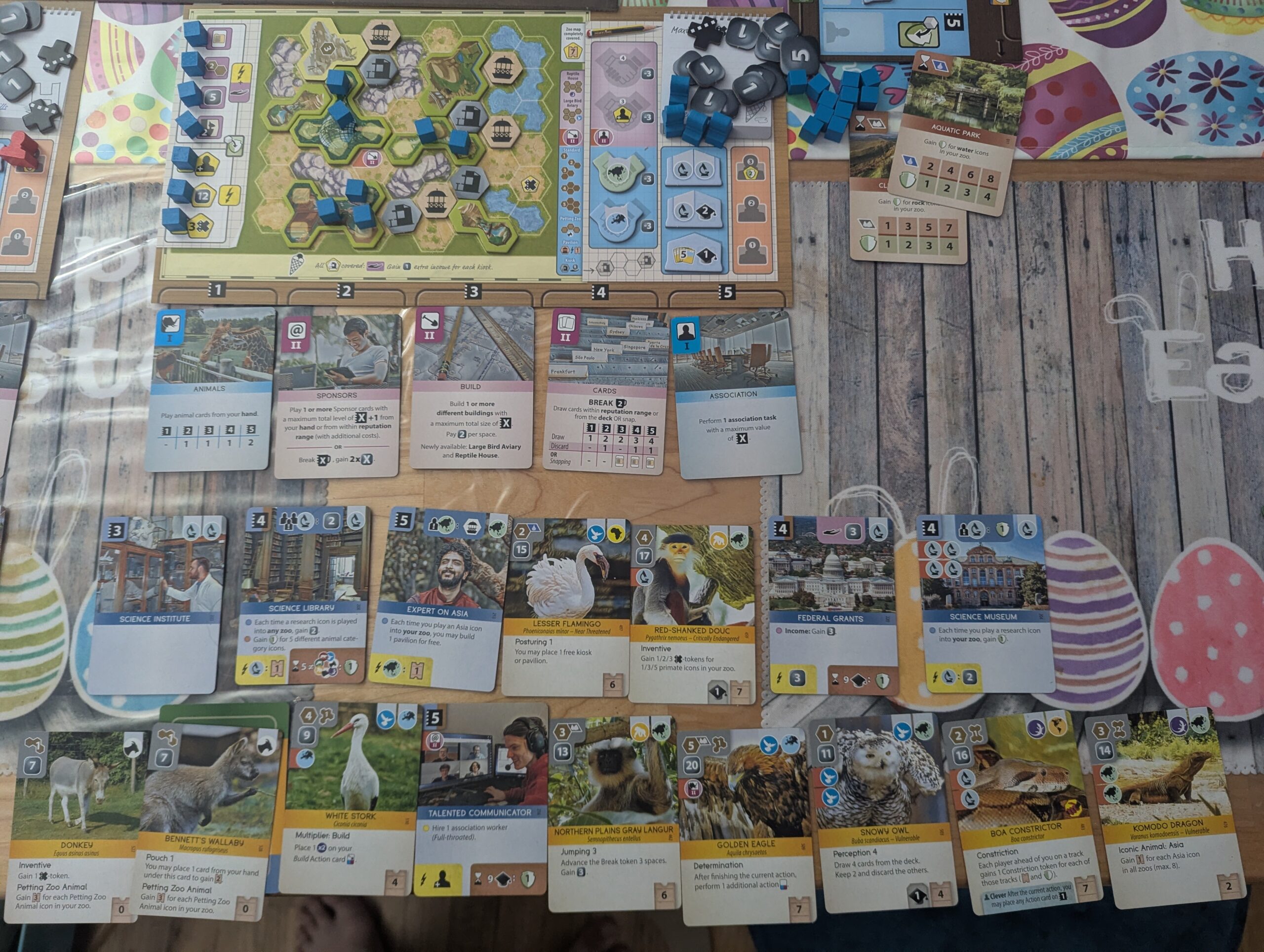 Finally there is the Association action which is the fiddliest and requires we go to our board annex. Thematically this represents sending administrative staff out to do PR and make connections with the broader conservation community. Like with Sponsors, the strength of the Association action determines which of the 4 actions you can take on the board with a 5th bonus action unlocked when you level up the Association action. Unlock any of the other actions, you also need to send out a little meeple to take this action. As the game goes on you unlock more meeples and can take more and more actions. The first is to boost your reputation (represented by the little mortarboard cap) which grants you special bonuses on a third (non-score) tracker. The second action is to partner with a continent which can make it easier to secure animals from that region. The third action is to partner with universities to grant reputation or research bonuses as well as increasing your hand size. The fourth action is to contribute to conservation cards4. You do this by taking a cube off your sheet (unlocking a little bonus, Scythe-style) and claiming one of the slots you qualify for, gaining a bump to your conservation score. In the picture above, players could try to collect birds, American animals, or Asian animals. At the start of the game, three of these base conservation cards are revealed and act as a shared motivation for all players but throughout the game new cards can be played and competed over. The bonus action allows you to donate cash for conservation points which can be a great late game catch-up mechanism.